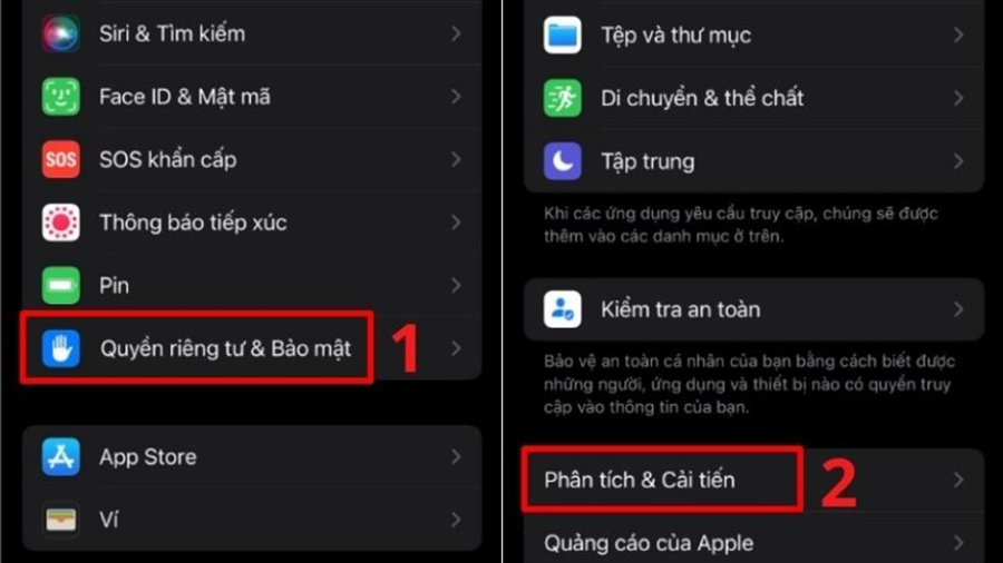 Bước 1: Mở ứng dụng Cài đặt trên iPhone. Lướt xuống và chọn Quyền riêng tư & Bảo mật. Cuộn xuống cuối màn hình và chọn Phân tích & Cải tiến.