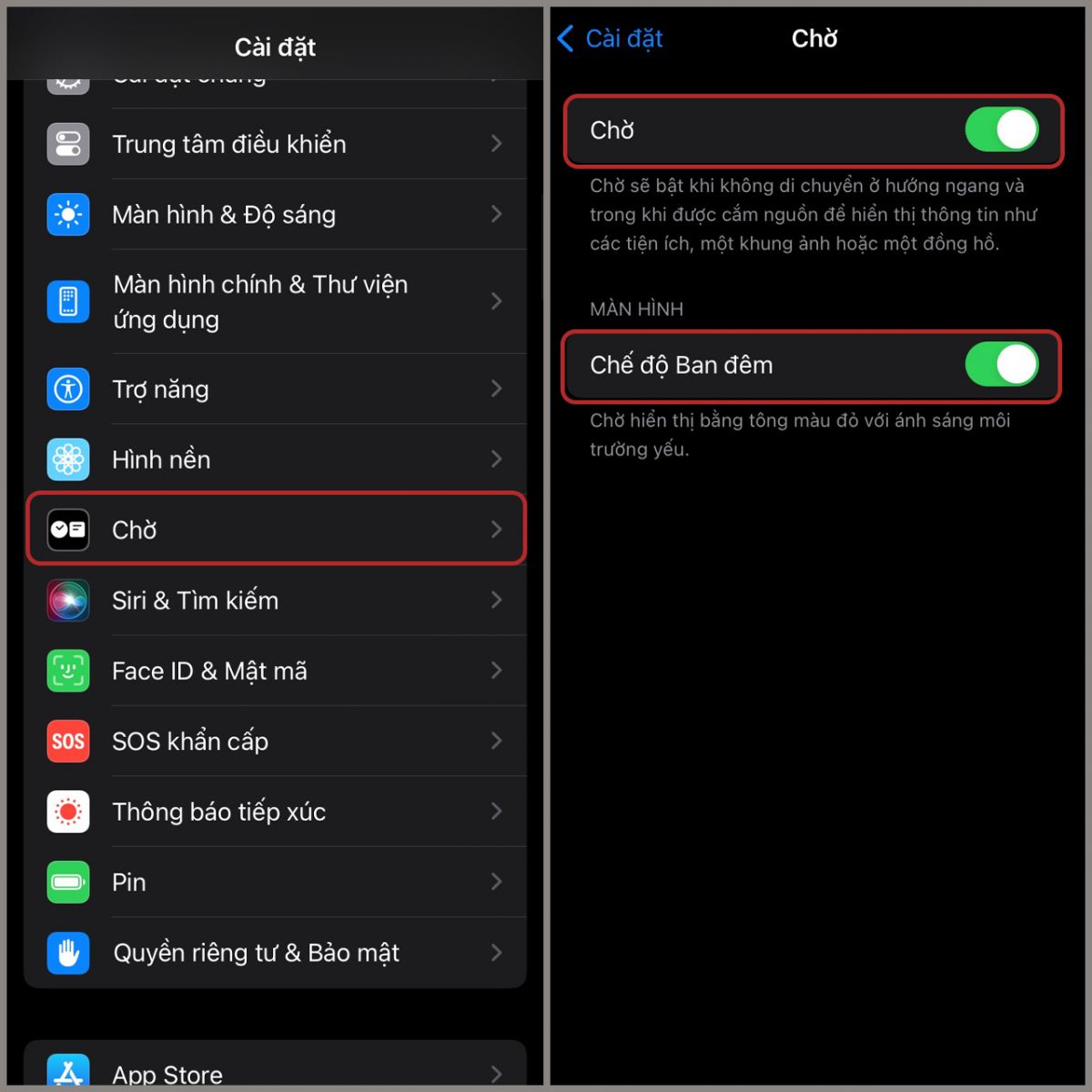 Bước 2: Truy cập Cài đặt trên iPhone > Chọn mục Chờ > Tiến hành bật công tắc mục Chờ và Chế độ Ban đêm.