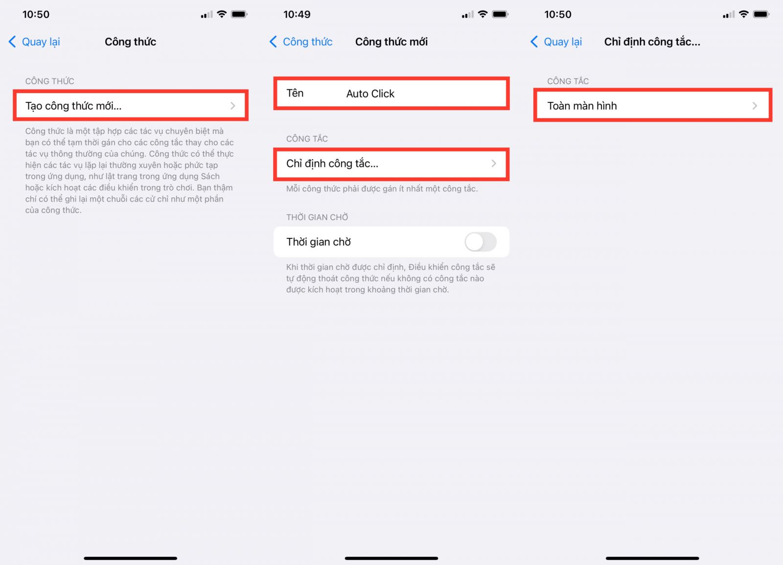 Nhấn Tạo công thức mới => Đặt tên cho công thức là Auto Click và nhấn chọn Chỉ định công tắc.