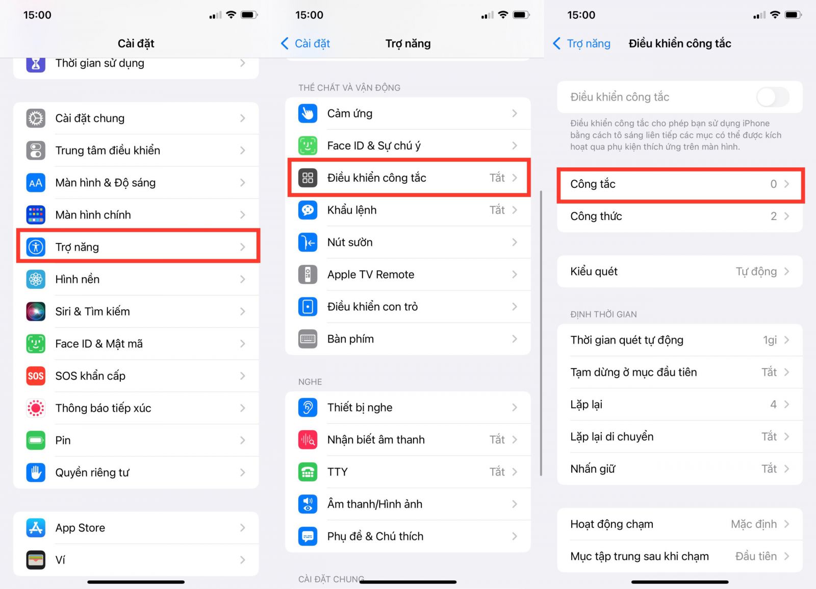 Bước 1: Vào Cài đặt => Chọn Trợ năng => Chọn Điều khiển công tắc => Chọn Công tắc.