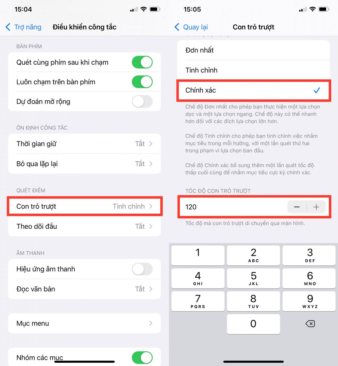 Bước 10: Tại mục Con trỏ trượt => Bạn chọn chính xác và thay đổi tốc độ thành 120 => Sau đó quay lại mục Trợ năng và chọn vào Phím tắt ở năng ở cuối trang.