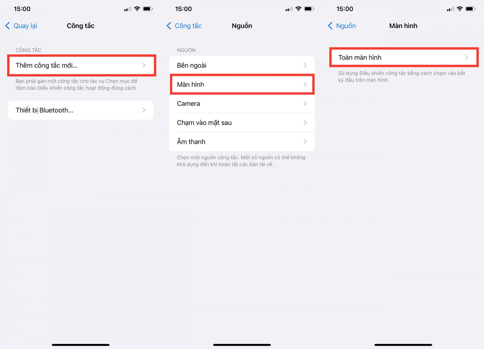 Bước 2: Nhấn vào mục Thêm công tắc mới => Chọn Màn hình => nhấn chọn Toàn màn hình.