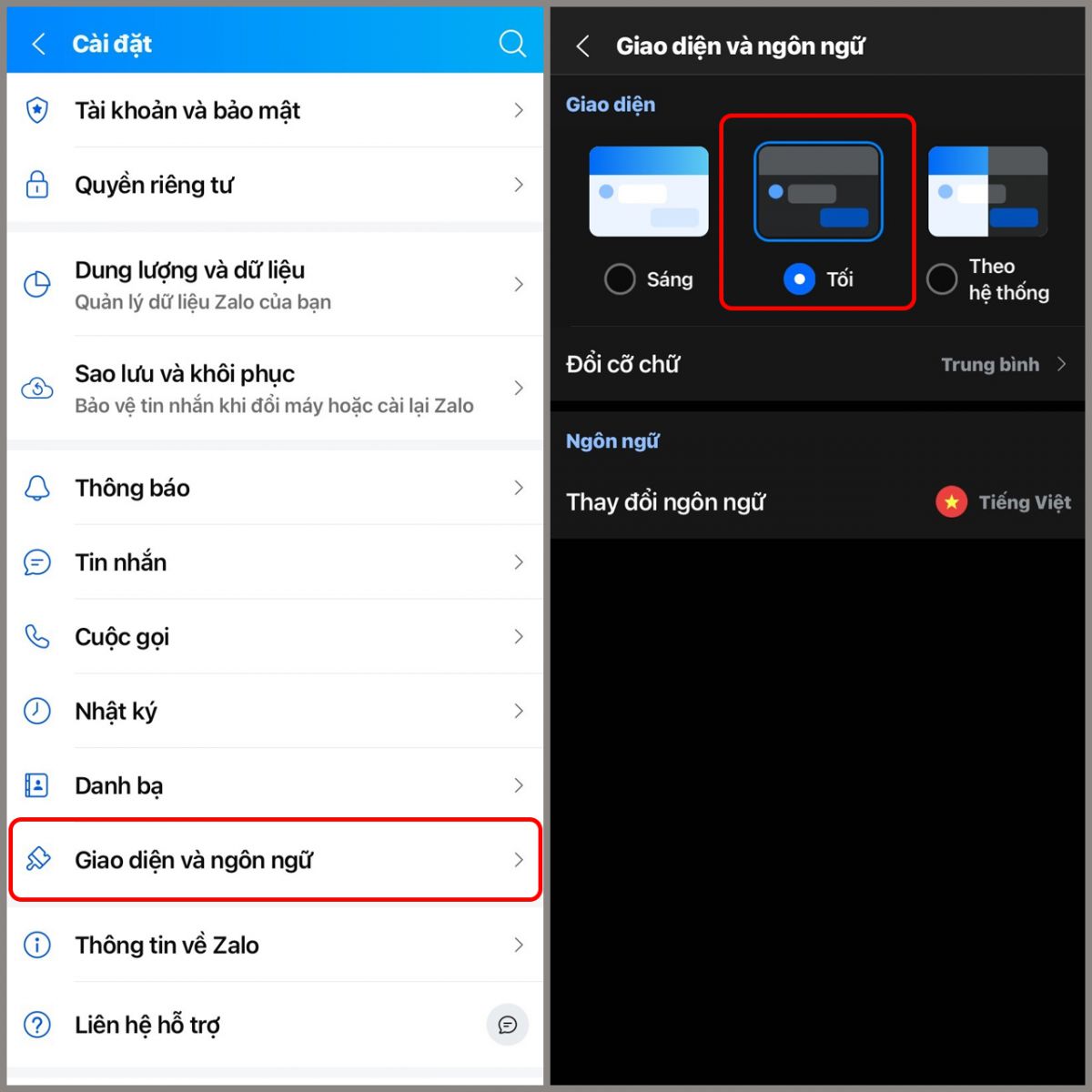 Trong mục Cài đặt, chọn Giao diện và ngôn ngữ > Chọn giao diện Tối để chuyển Zalo sang giao diện ban đêm.