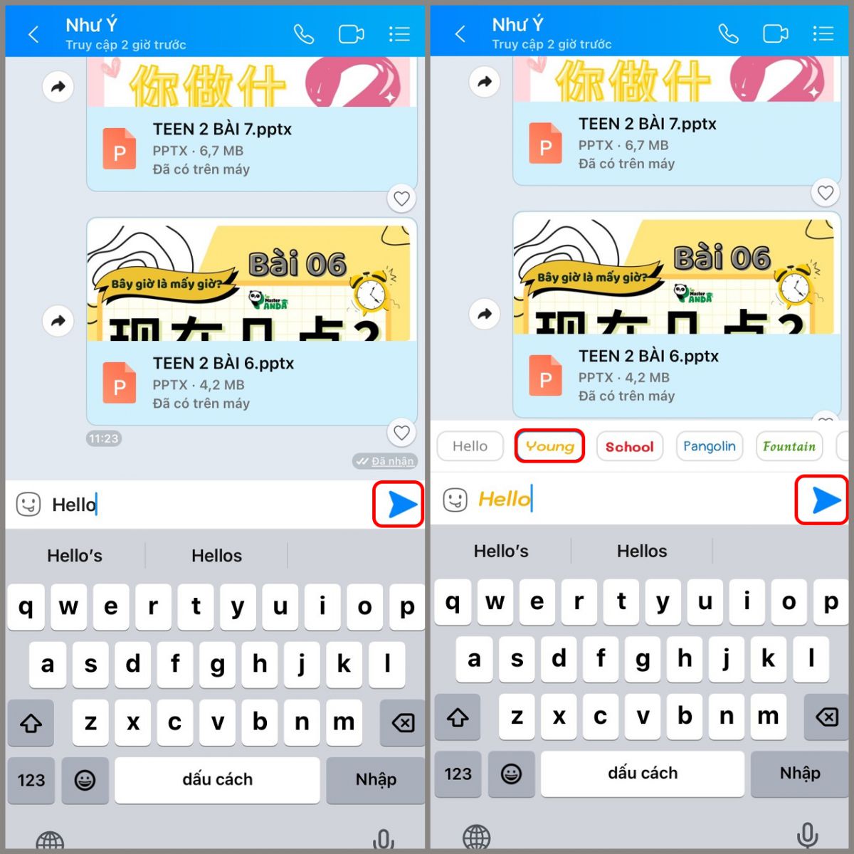 Bạn soạn tin nhắn như bình thường, sau đó nhấn giữ im nút Gửi, tùy chọn các kiểu chữ sẽ xuất hiện phía trên > Nhấn chọn kiểu chữ bạn yêu thích để đoạn chat trở nên sinh động và thú vị hơn.