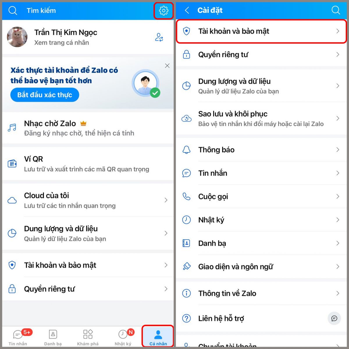 Bước 1: Trên thanh công cụ phía dưới màn hình, chọn mục Cá nhân > Chọn biểu tượng Cài đặt > Tài khoản và bảo mật.