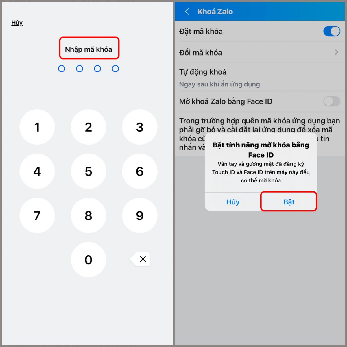 Bước 3: Đặt mã khóa mới cho ứng dụng > Khi xuất hiện cửa sổ thông báo Bật tính năng mở khóa bằng Face ID, bạn có thể nhấn Bật để dùng Face ID thay cho việc nhập mã khóa.