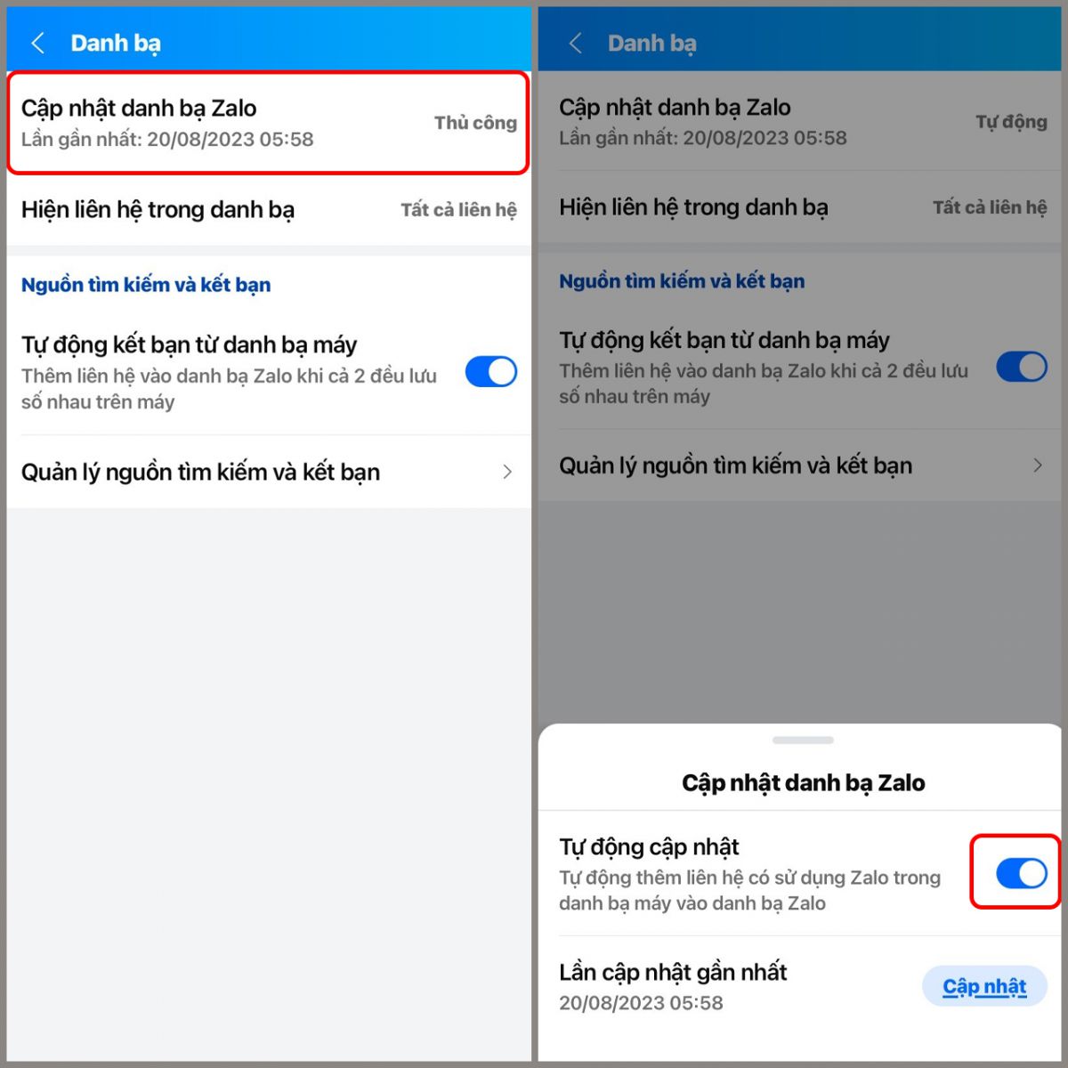 Bước 2: Chọn mục Cập nhật danh bạ Zalo > Nhấn vào công tắt để bật tính năng Tự động cập nhật danh bạ.