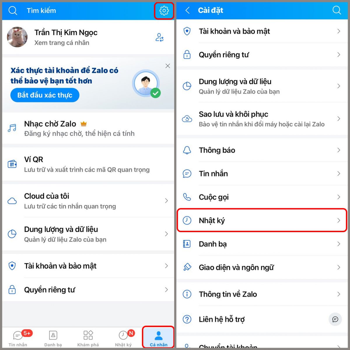 Bước 1: Trên thanh công cụ phía dưới màn hình, chọn mục Cá nhân > Chọn biểu tượng Cài đặt > Chọn mục Nhật kí.