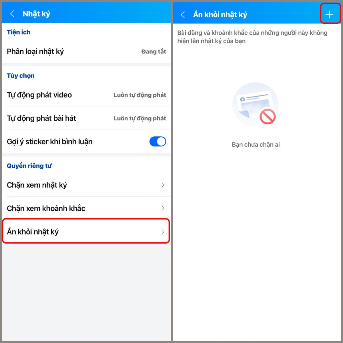 Bước 2: Tại phần Quyền riêng tư, chọn Ẩn khỏi nhật ký > Nhấn vào dấu cộng để thêm người dùng bạn muốn ẩn nhật ký của họ.