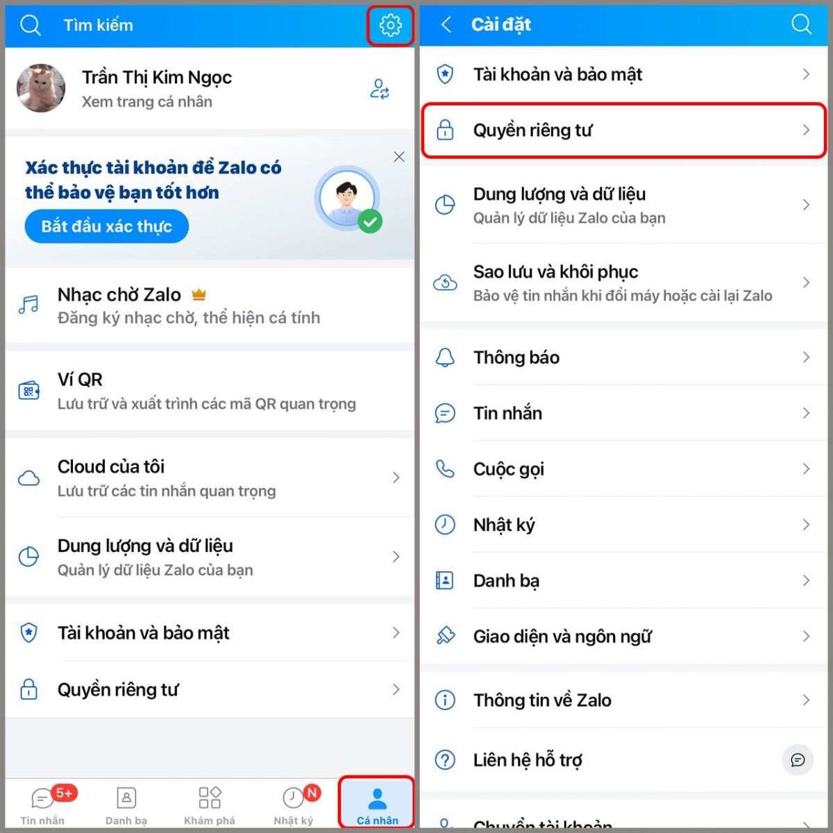 Bước 1: Trên thanh công cụ phía dưới màn hình, chọn mục Cá nhân > Chọn biểu tượng Cài đặt > Quyền riêng tư.