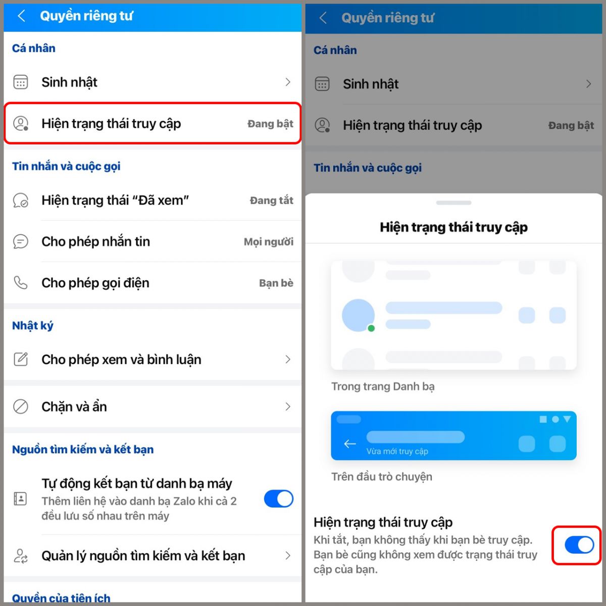 Bước 2: Tại phần Cá nhân, chọn Hiện trạng thái truy cập > Gạt công tắt sang trái để tắt tính năng hiện trạng thái hoạt động khi bạn online. Khi tắt bạn sẽ không thấy trạng thái truy cập của bạn bè và bạn bè cũng sẽ không thấy trạng thái của bạn.