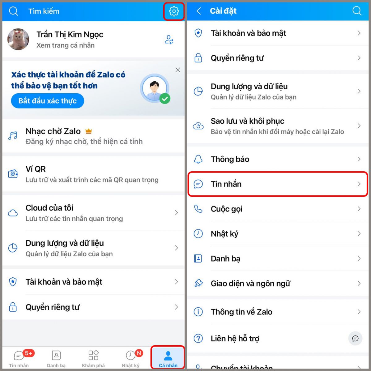 Bước 1: Trên thanh công cụ phía dưới màn hình, chọn mục Cá nhân > Chọn biểu tượng Cài đặt > Chọn mục Tin nhắn.