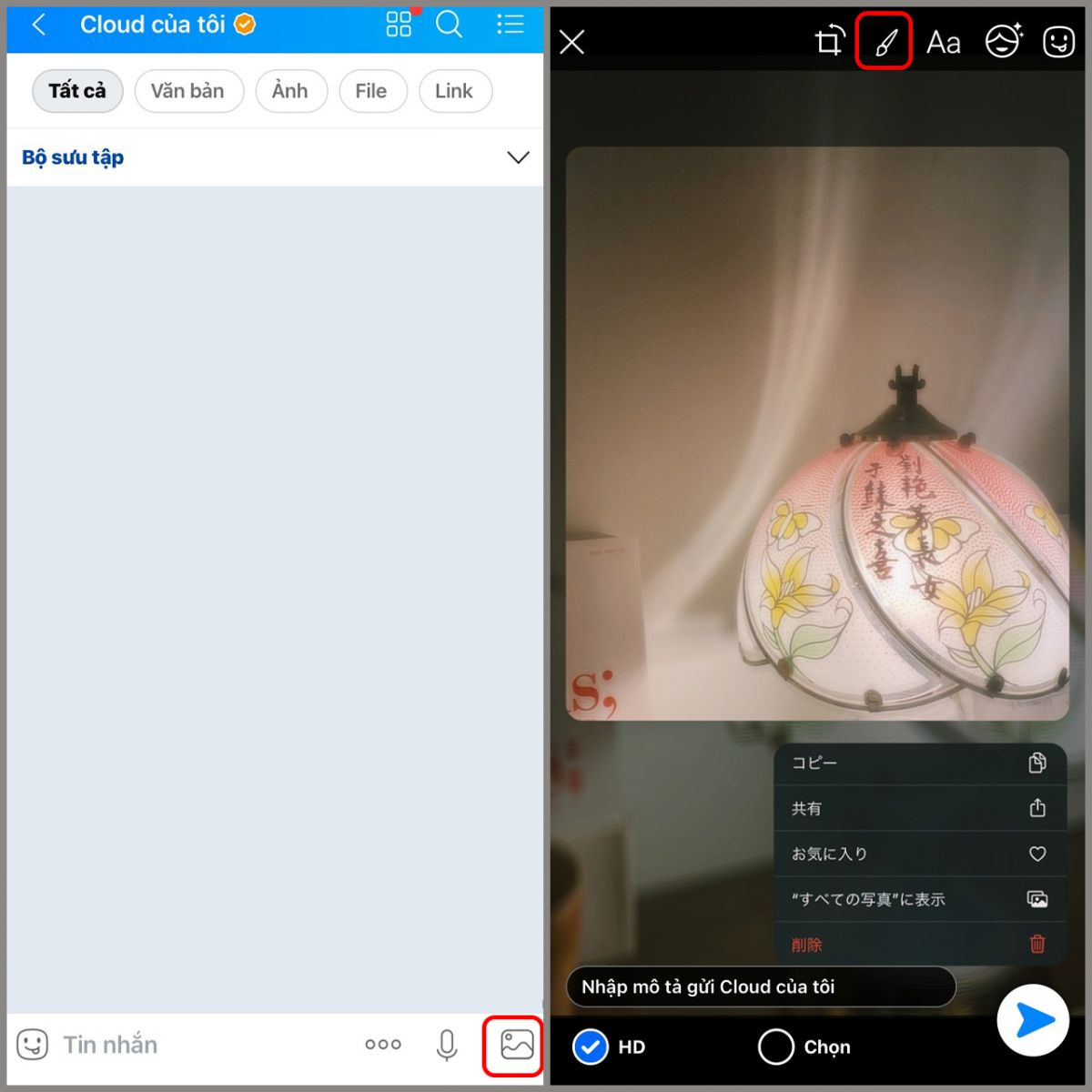 Bước 1: Trong đoạn chat bất kỳ, bạn chọn vào biểu tượng ảnh để mở thư viện ảnh > Sau đó chọn vào 1 ảnh để chỉnh sửa ảnh trực tiếp trên Zalo > Nhấn vào biểu tượng cây bút để vẽ lên ảnh.