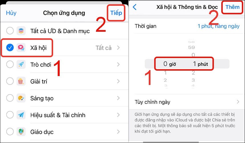 Bước 6: Chọn một hoặc nhiều ứng dụng muốn khóa > Nhấn vào Tiếp > Chỉnh thời gian muốn khóa > Nhấn Thêm.'