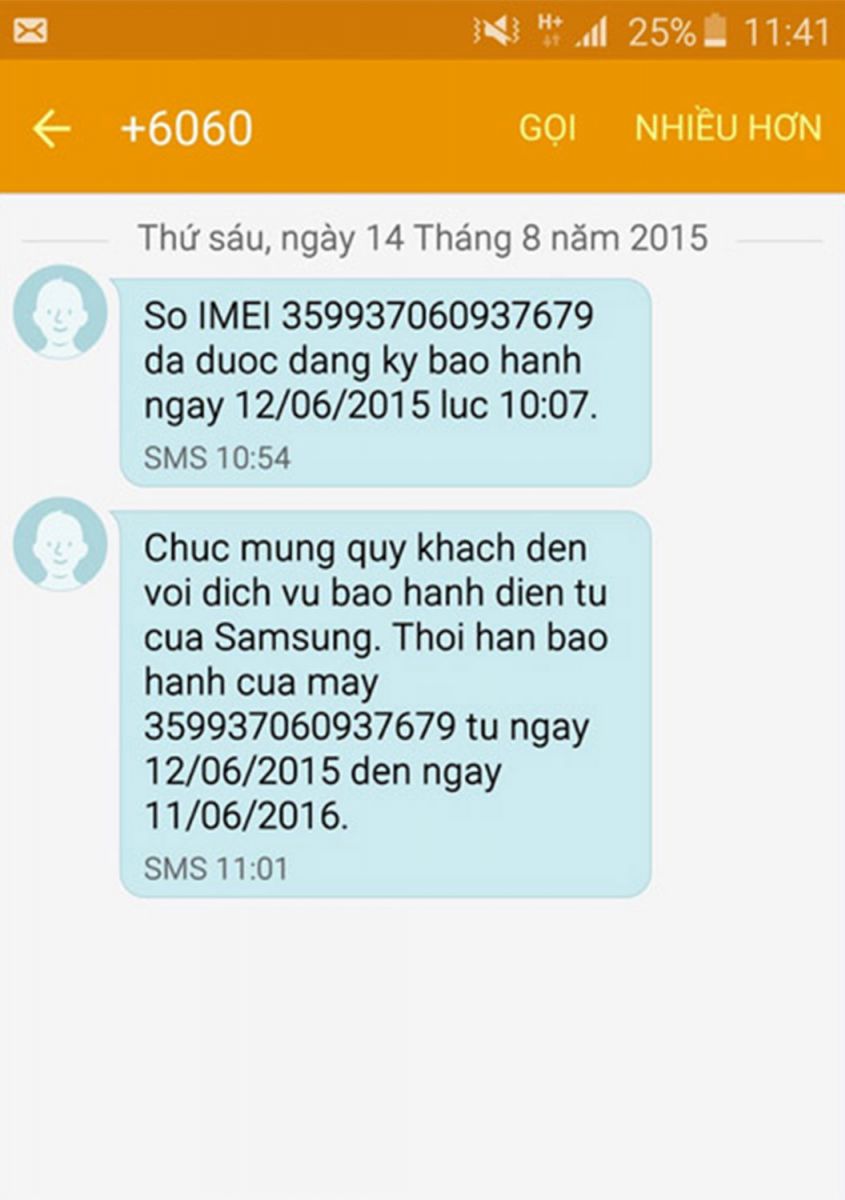 Cách gửi tin nhắn là soạn tin theo cú pháp [số IMEI] rồi gửi đến 6060. Bạn sẽ nhận được phản hồi trong vòng 3 – 5 phút, nếu không có tin nhắn trả lời hoặc thông báo “sai cú pháp”, thì thiết bị của bạn có thể không phải do chính Samsung sản xuất.