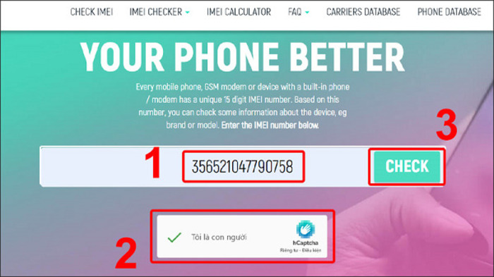Bước 2: Nhập mã số IMEI vào trong thanh ô chữ “Enter IMEI…” ⇒ Chọn dấu tích Tôi là con người ⇒ Chọn vào nút Check để kiểm tra.