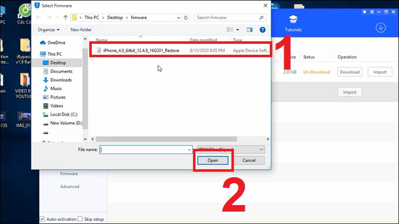 Bước 4: Chọn phiên bản iOS cần restore từ máy tính > Nhấn Open.