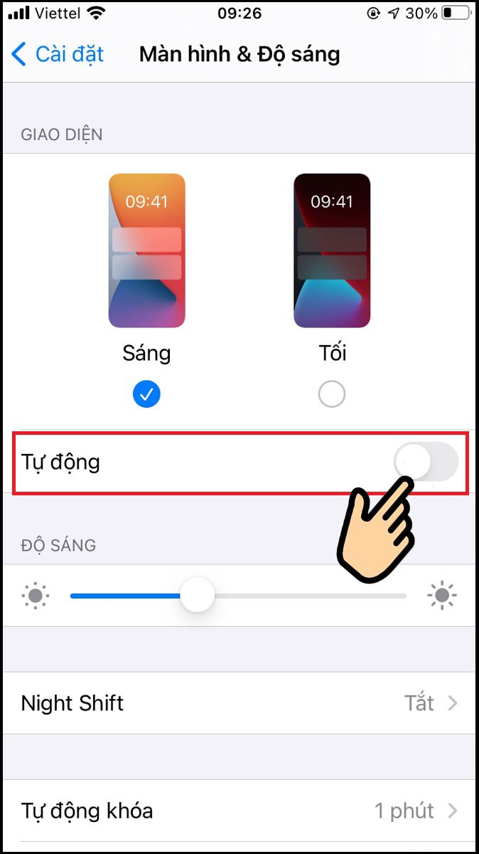 Bước 2: Tới Độ sáng tự động tắt bằng cách gạt thanh ngang sang trái.
